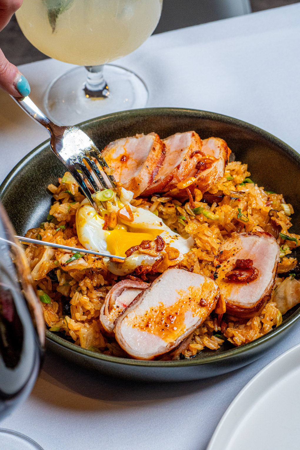 “We brine the pork with maple, molasses, ginger, star anise, cinnamon, bay, thyme, and garlic,” says Burk. Burk then thinly slices double-smoked bacon and rests the loin overnight “so the bacon and pork become one.” A few moments on the grill and – poof! – deliciousness. The dish hits every textural and flavor element when the pork, along with a 64° egg, is laid atop kimchi fried rice. The thundering roar of umami lead me to polish my plate.