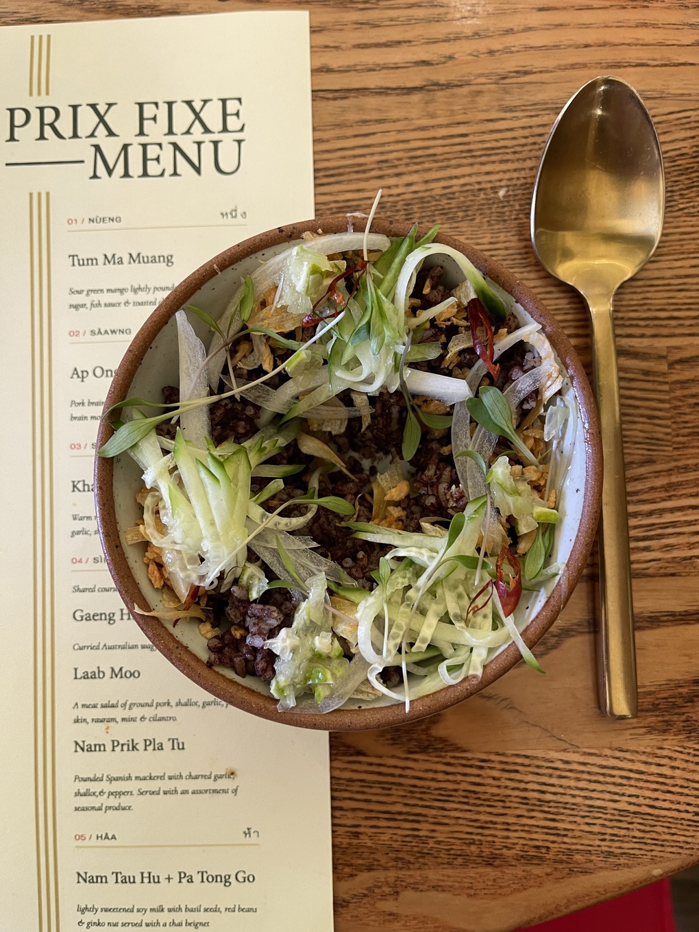 If you think Thai food has gotten boring, Tanzie’s Cafe in Berkeley will quickly dispel that notion with its five-course tasting menu. Studded with dishes like Nam Prink Pla Tu (pounded mackerel with garlic), Laab Moo (ground pork with rau ram and mint), Ap Ong Awe (pork offal custard with curry and makrut), and Tum Ma Muang (sour mango with coconut sugar, fish sauce and chili), any dish might blow your socks off. But I fell hardest for the rice salad.
