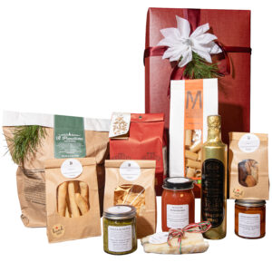 Longtime friends, chefs Donato Scotti and Gianluca Guglielmi each relocated to the United States where they now run multiple restaurants in the San Francisco Bay Area. A tiny shop at their Oakland trattoria displays house made pastas and panettoni, jarred caponata, and curated salumi. Packaged in a beautiful red box with poinsettia flourish by Gianluca’s wife, Paola, the Infermentum includes one of the duo’s famous panettone alongside cookies, jam, giardiniera, olives and grissini. It’s a party waiting to happen.