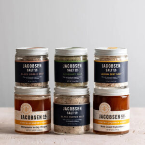 Harvested from the cold waters of Netarts Bay on the Oregon Coast, Jacobsen’s flaky salts taste of the Pacific’s salinity. Here, they are nestled in a gift box with Raw Blackberry and Wildflower honeys, which showcase the sweeter side of the region’s terroir. Trendy Black Garlic adds a subtle sweetness and hints at garlic’s power. I sprinkled Lemon Zest on shortbread cookies and used Rosemary as a finishing salt for bowls of split pea soup. The full set includes: