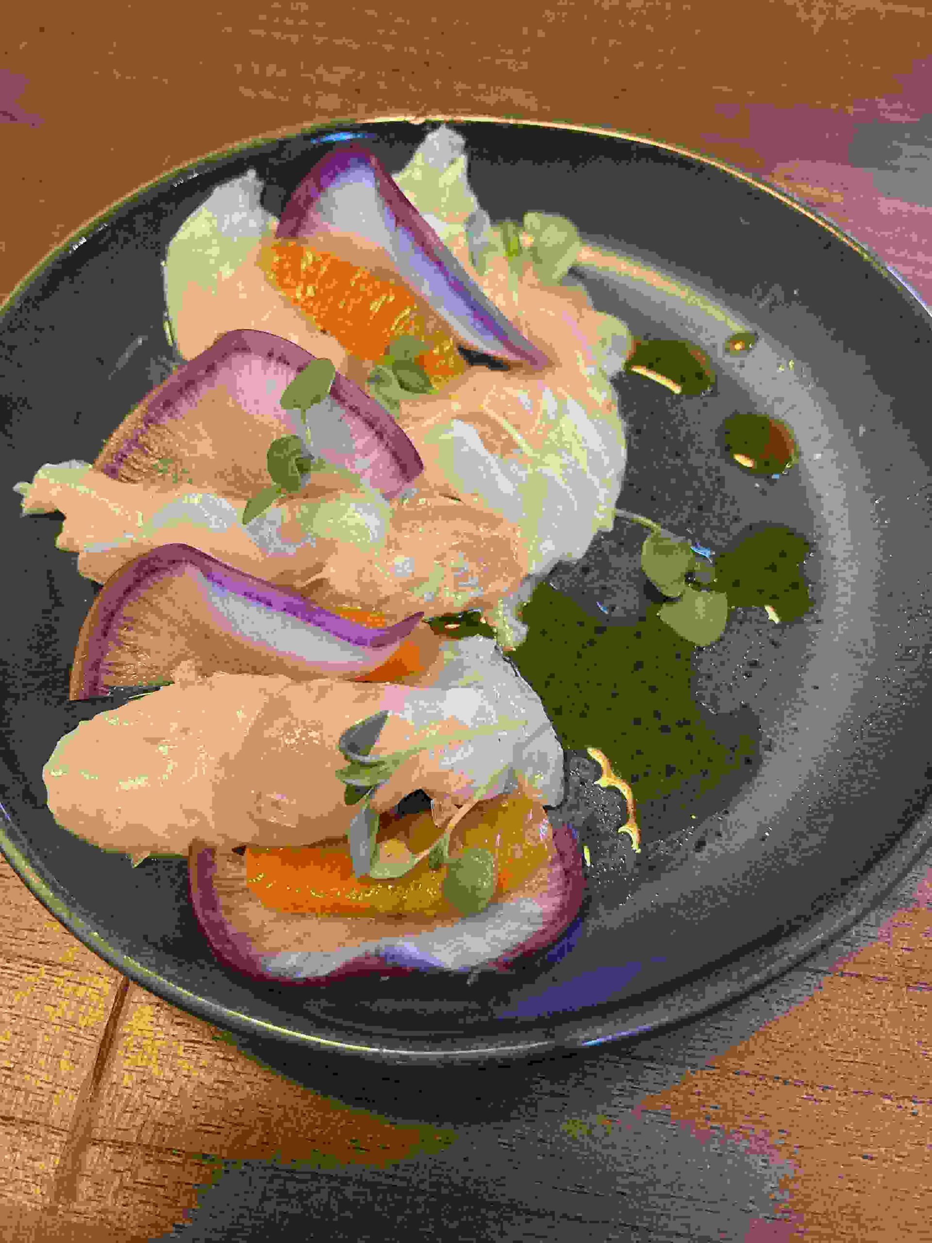 halibut crudo with citrus and radish at Fifty Vara a San Francisco restaurant in Inner Sunset