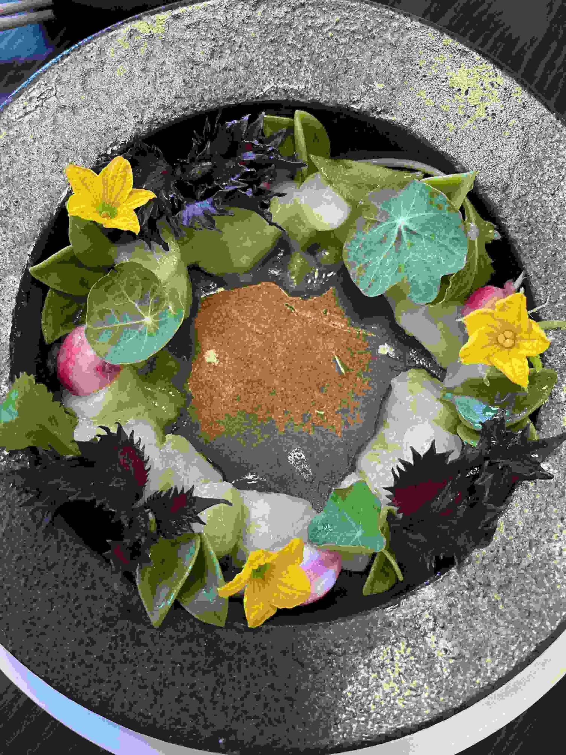 Hokkaido Scallop dressed with flowers and greens as served at RO restaurant & Lounge in Yountville, Napa Valley