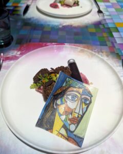 I and my friend, Lotus, ate our way through seven courses (one meaty, one vegetarian) inspired by da Vinci, Banksy, Picasso, Dalí, Pollock, Warhol and Van Gogh. The fun is in the perception shift: We solved codes to open boxes revealing delicious treasure, sprayed sea bass with “perfume,” and lifted steak from a Campbell’s soup can…while it rolled away. My favorite two moments? When the Chef-Narrator “dropped” from the ceiling of Michelangelo’s Sistine Chapel and “ran” across my plate and when Dali’s clock “melted” over my wrist. I didn’t mind making my own paintings of “Starry Night” with chocolate, either.