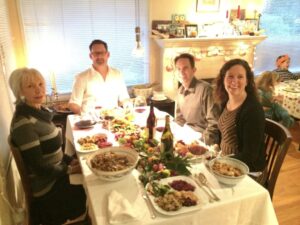 Our Thanksgiving table – the gluten-free stuffing is in the big bowl and on every plate