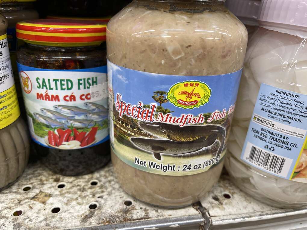 Home » My Cambodia, A Cookbook Review » mud fish sauce on the shelf at Asian Market San Rafael